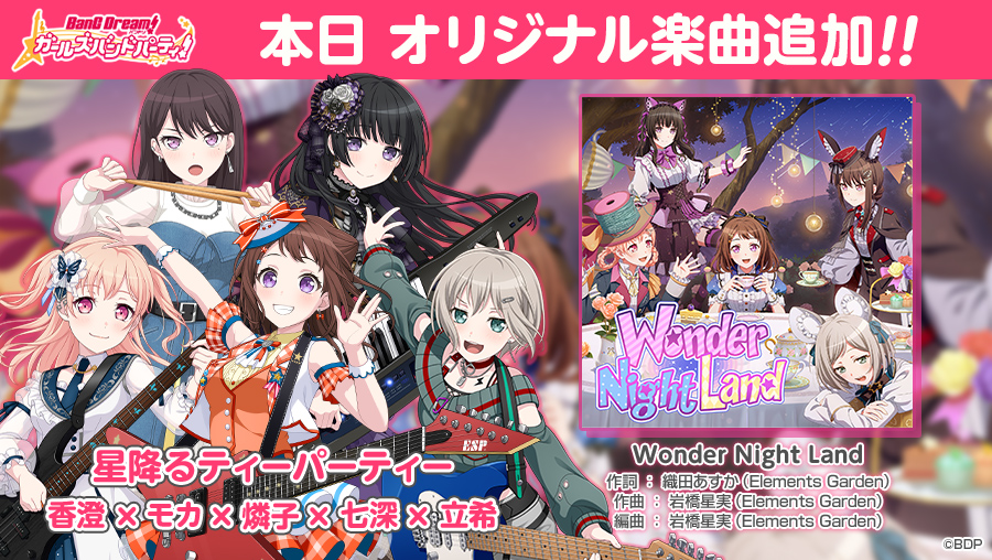 第5回ガールズバンド総選挙で1位に輝いた「星降るティーパーティー」が歌う『Wonder Night Land』を追加いたしました。
