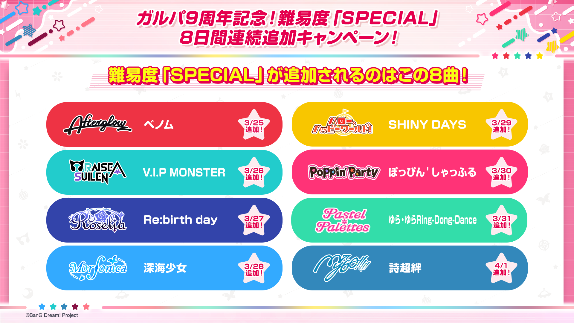 また、9周年を記念して各バンドから1曲ずつ、以下の楽曲に難易度「SPECIAL」を追加する『ガルパ9周年記念!難易度「SPECIAL」8日間連続追加キャンペーン!』も開催予定です。